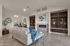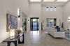 Inside, the home's open-concept layout flows seamlessly with premium ceramic flooring, wide hallways, and designer lighting. The Great Room impresses with a custom mantle, a 6-foot electric fireplace, and coffered ceilings adorned with hand-painted details that enhance the space's unique charm. The gourmet chef's kitchen is equally impressive, featuring Thomasville cabinetry, quartz countertops, a barrel ceiling, and high-end All-American appliances, ideal for cooking and entertaining alike.