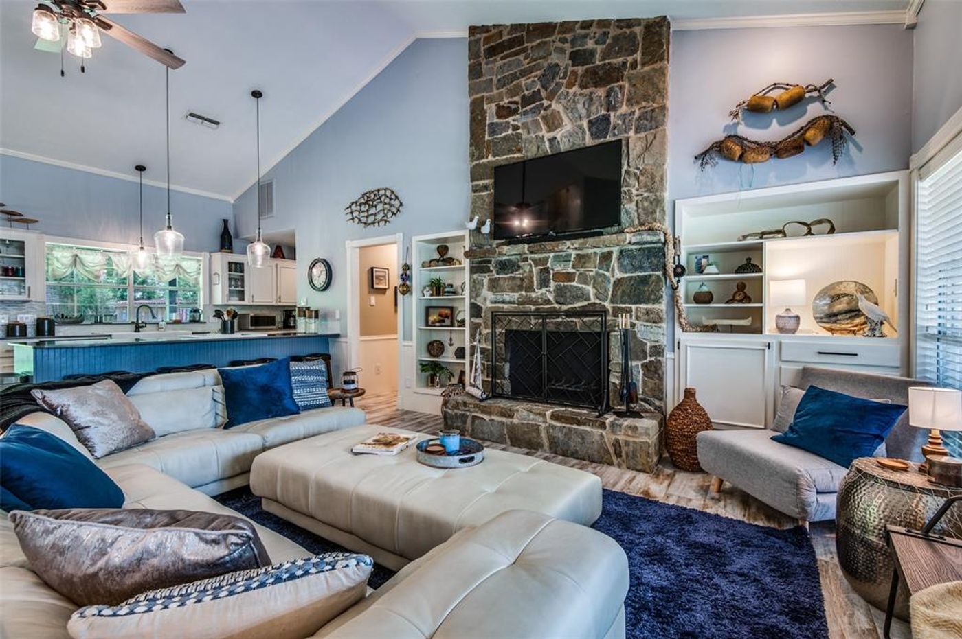 Adorable rustic lake cabin on two waterfront lots. Huge open living area with wood burning stove to complete the rustic appeal. Concrete counter in the kitchen with granite on the island. Primary bedroom on lower level with large bathroom filled with country charm. Walk out from master to the backyard patio. Fully fenced huge yard with plenty of room for kids and pets. Mature trees, detached carport. Concrete retaining wall with sidewalk. Water depth at full pool will accomodate low profile boat, pontoon or PWC. Nice elevated view of the lake from the house and patios. VRBO's are OK.