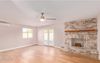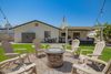 Interior features marble tile & wood floors, recessed lighting, brick fireplace, barn doors, and French doors to a backyard oasis with green grass, shade trees, fire pit, RV gate, covered patio & paver areas.