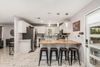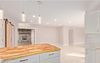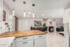Chef's kitchen with white shaker cabinets, quartz counters, butcher block breakfast bar, backsplash, and pendant lights.