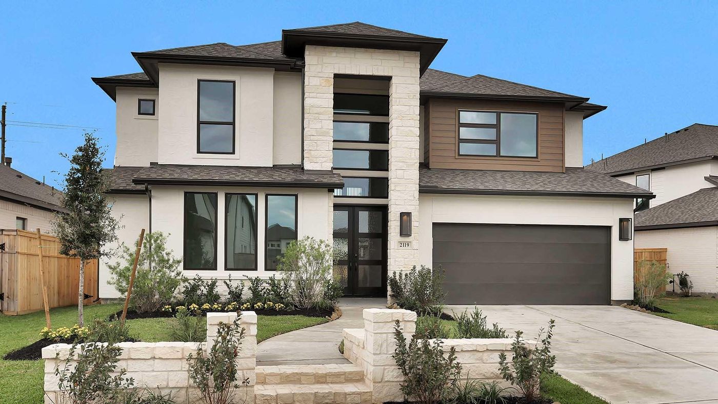 CalculatePOPULAR - Newmark Homes - KOBLENZ is our model floor plan. Modern Elevation - 2 story home, 5 bed 4.5 baths, and a 3 car garage. Main and secondary bedroom down with en-suite bath. Guest Powder room as well! 3 bedrooms up with jack and jill bath. High foyer entry with view of curved staircase, high ceilings and the massive wall of windows in Family Room. Open Kitchen concept with large island, 5-burner Gas Cooktop, upgraded porcelain countertops, and beautiful backsplash. Hardwood floors in Entry, Kitchen, Breakfast nook and Formal Dining.