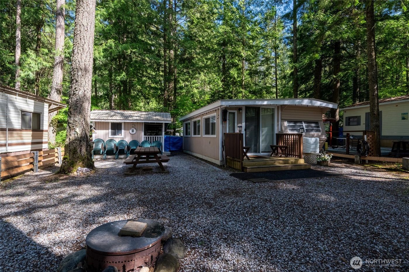 Welcome to this entry level retreat into nature at The Glen. Zoned for 120 days of use this division 6 unit has all the comforts of home with add-on room in this 1981 trailer, providing more sleeping space. A shed with electricity has a freezer and a built-in bed. The lot also includes a firepit for your enjoyment. The Glen boasts multiple pools, spa, sauna, tennis courts, laundry, trails, and more in stunning opportunities to enjoy nature at its best. The Glen is a gated community ready for your getaway. Don't miss this gem!