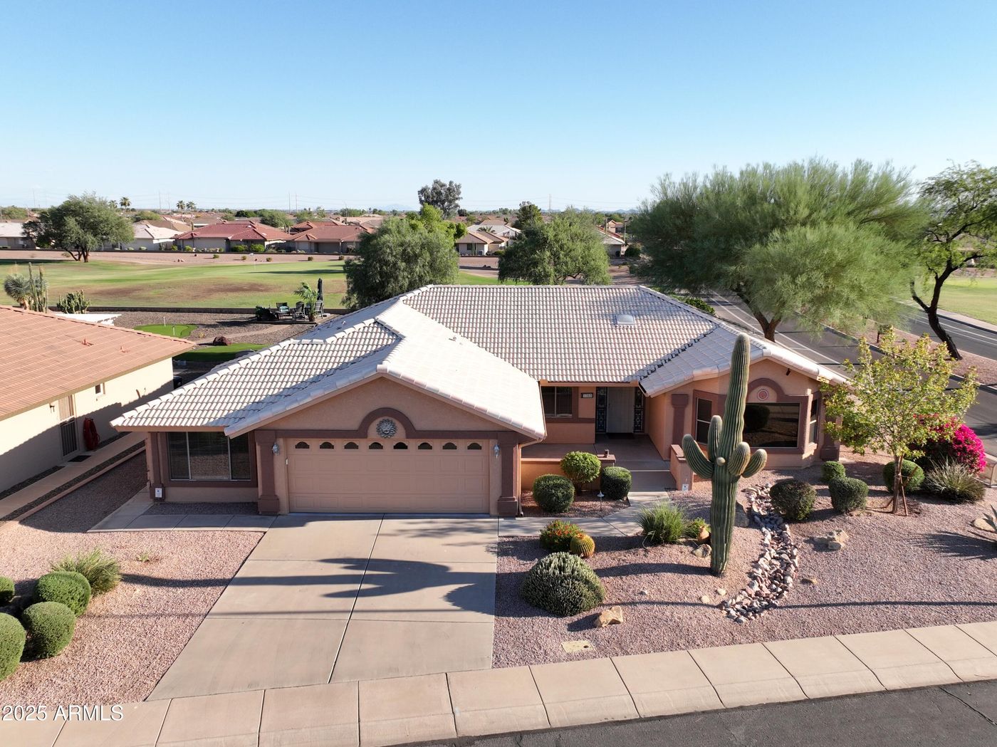 New LOWER PRICE & Fresh New Interior Paint! This beautiful home is move in ready! Upon arrival, you will be greeted by a 2-car garage & a large front patio, overlooking views of the golf course. Discover a homey interior featuring vaulted ceilings, wood look porcelain tile flooring & a spacious living room where you can relax after a long, tiring day. Impeccable kitchen highlights white cabinets, SS appliances, stylish granite counters & a breakfast bar. The AZ room is bathed in abundant natural light, an ideal spot for quiet reading or sipping your morning coffee. The owner's suite showcases a bathroom w/dual sinks & a walk-in closet. You'll love the serene backyard w/grassy landscaping & a pergola for al fresco dining. Also, a 14ft swim/spa included in the sale!