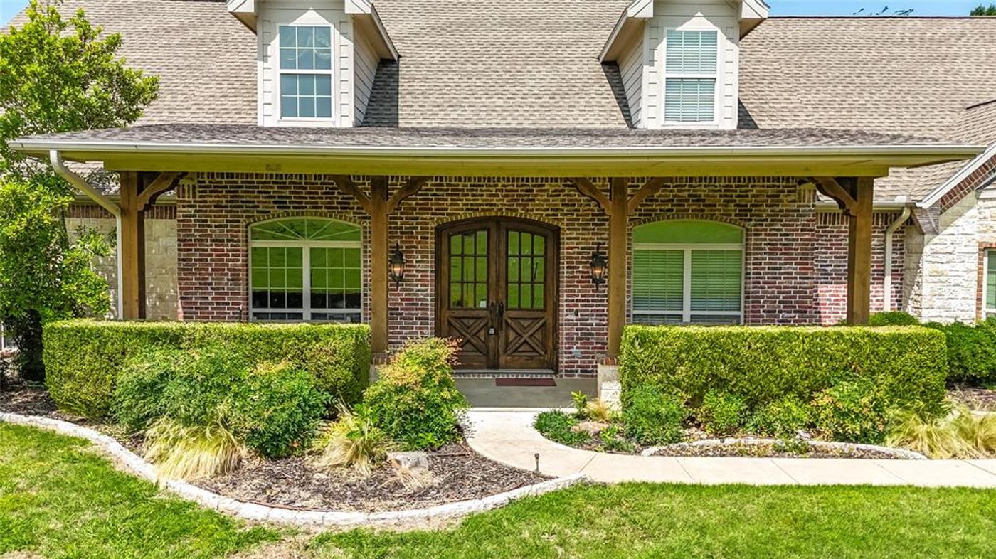 Beautiful home on over two picturesque landscaped acres in Van Alstyne! This gorgeous property has no HOA, is outside city limits and has something for everyone: a HUGE 36x45 Morton building complete with 3 large overhead doors, side door, electricity & plumbing, Texwin 2020 RV boat storage building, fenced-in side yard, additional fenced-in space for chickens or other animals, and even a HUGE swimming pool with a covered back patio for relaxing and entertaining. The inviting home is bright with natural light with all downstairs windows just replaced last year! Primary bedroom is downs, two cozy fireplaces, wonderful flex room can be used as a second living room, game room, or whatever you want it to be. Three secondary bedrooms up as well as a balcony overlooking the pool. Kitchen has SS appliances, pot filler, gas cooktop & double ovens! This gorgeous lot features a tree-lined creek on the south side of the property. Come see this slice of heaven!