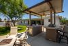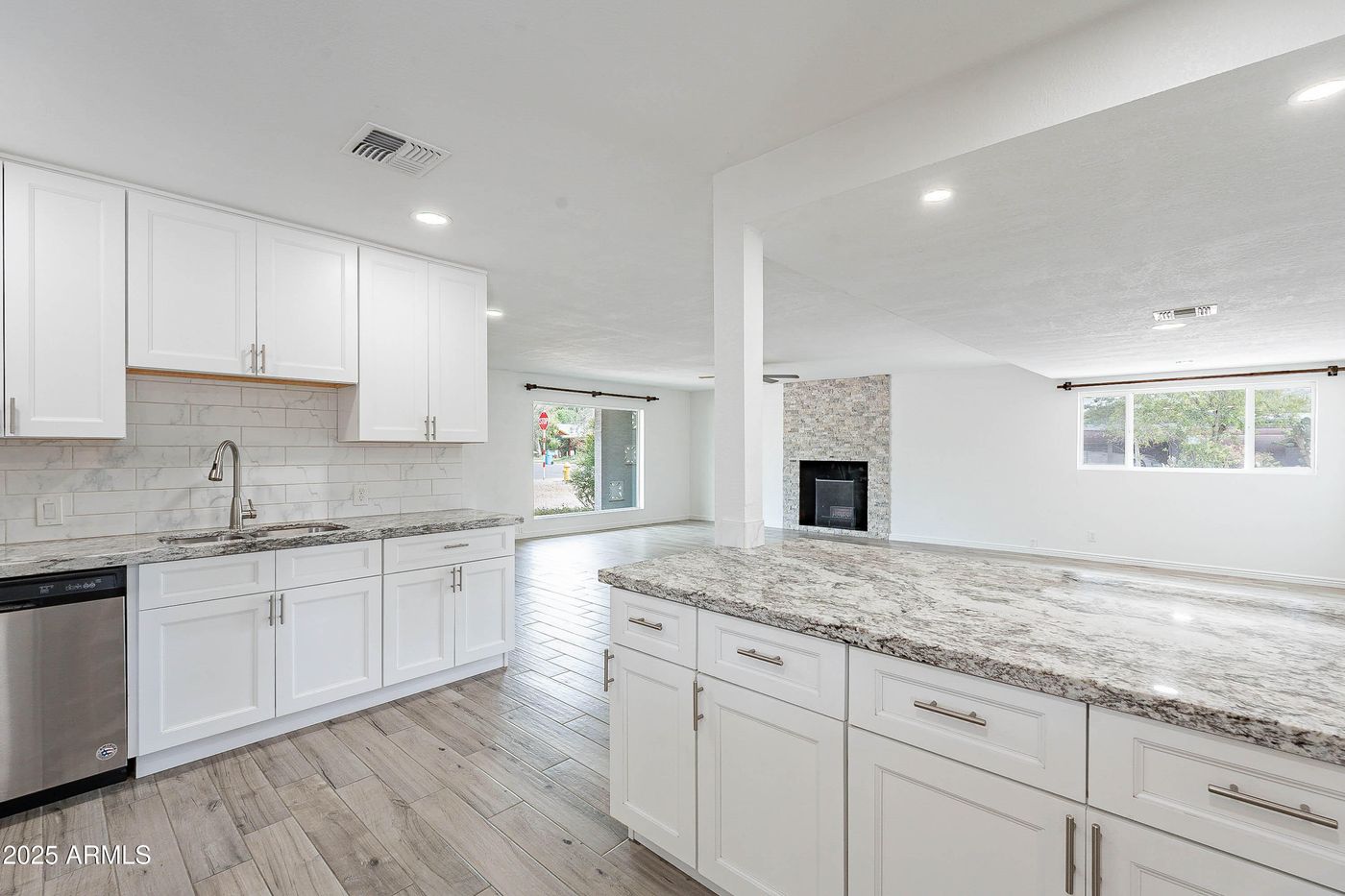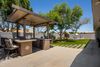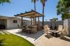 Welcome to this beautifully maintained home, thoughtfully upgraded to offer both comfort and style. The heart of the home features a modern kitchen with custom cabinetry, gleaming granite countertops and stainless steel appliances, seamlessly flowing into the inviting family room with a cozy wood burning fireplace. French door opens to a meticulously landscaped backyard, complete with a newer paver patio, turf grass, and a storage shed discreetly tucked behind the RV gate. The exterior has been upgraded with energy efficient foam insulation and Dryvit stucco. Enjoy outdoor living year-round under the covered patio., enhanced with a ceiling fan and lighting. Inside, dual pane vinyl windows and plantation shutters. Spacious primary suite boasts a custom walk-in closet, dual vanity and a beautifully tiled shower. The hall bathroom mirrors this attention to detail, featuring a granite-topped vanity and a fully tiled bathtub. Additional highlights include walk in closets in secondary bedrooms, an epoxy-coated garage floor and a prime location on a quiet cul-de-sac. Conveniently located near spring training facilities, shopping, major freeways and the airport, this exceptional home is the perfect blend of quality, comfort and convenience.