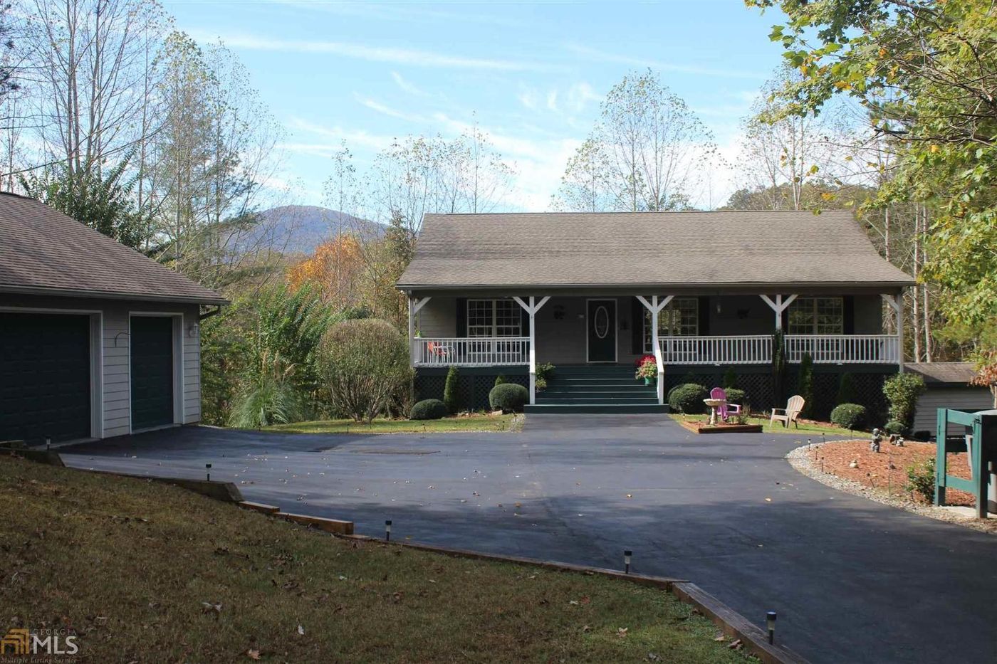 Immaculate and well maintained 3600 sqft 3BR/3BA ranch with finished basement, mountain views, and 3.34+/- acres on cul-de-sac in highly desirable Panorama Estates. Private community river access to the Chattahoochee River. Minutes from the scenic Bavarian town of Helen Georgia, historic Sautee Nacoochee, Chattahoochee National Forest, state parks, and North Georgia Mountains. Master on the main with tongue and groove wood ceiling, large walk-in closet, bath with jetted garden tub and separate shower. Open floor plan with tongue and groove wood ceiling and walls in living room on the main with stone fireplace and spacious kitchen with breakfast bar and dining area. Terrace level with tons of daylight is professionally finished with faux plaster walls, second fireplace, recreational room, bar area, one bedroom, two bonus rooms with closets used as sleeping rooms, oversized full bath, and laundry room. Newer Berber carpet in bedrooms and basement bonus rooms. Front 400 sqft covered finished porch with tongue and groove wood ceiling extends the width of the house. Rear 500 sqft covered finished deck with tongue and groove wood ceiling is screened, extends the width of the house, and shelters the terrace level veranda. Large 900 sqft, insulated, two car, detached garage with attic storage area and entry level access to home. RV parking pad adjacent to garage with electrical hookup. Outbuilding with terrace level entry, tool storage, and workshop area with electrical connections. Huge 220 sqft free-standing, well maintained wood deck with forest entry great for entertaining. Three outside fire pits. Burglar alarm system with wireless and wired sensors. Trailwave fiber optic gigabit Internet service is installed and ideal for work at home professionals and streaming media entertainment. This is a nature lover's paradise in a quiet, private community with an abundance of wildlife, flora, and pristine waters of the Chattahoochee.