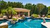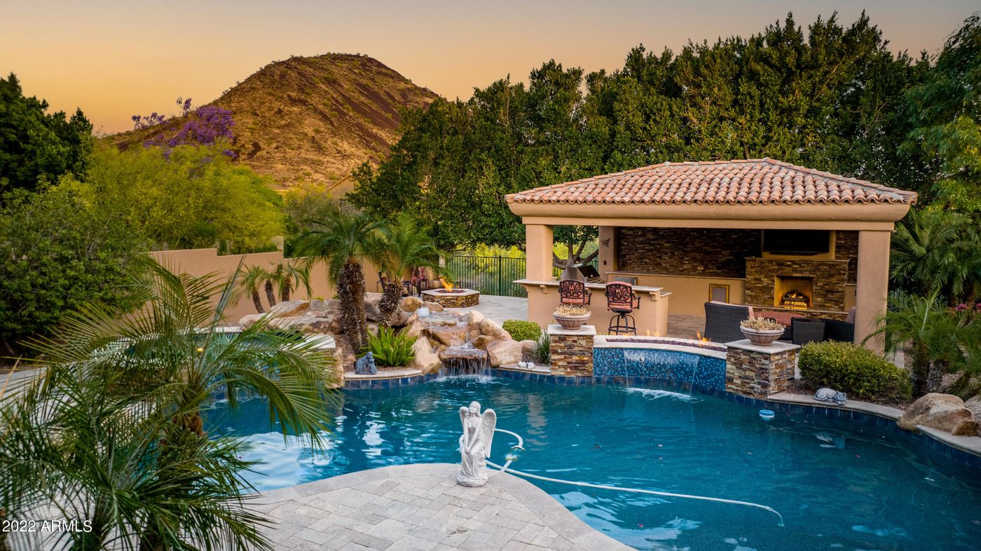 Finally, we step out into the most amazing private backyard you will ever see! A wall of 30 foot Ficus provides a mature, green backdrop to this wonderful entertainer's backyard, complete with oasis waterfall, sparkling pebble tech pool with dual waterfalls and fire pit, extensive tumbled travertine decking, hot tub, grassy play areas, another conversation gas fire pit and even a hidden lounge area under the ficus, offering private views of the wash behind the home. Both patios have built in professional grade Misting systems. This fantastic outdoor entertaining gazebo has a BBQ, wetbar, fridge, and built in ice bucket sink. Relax by the stack stone gas fireplace and enjoy the big game on the tv, or host a huge party with people sitting by the bar and enjoying the wired music system through the entire yard! Either way, this backyard offers it all! Need a place for all your toys? Plenty of room in the oversized epoxy painted side entry three-car garage with a full wall of extra deep storage cabinets and workbench. Lots of additional parking space on the paver stone driveway, or behind the large RV gate which provides even more storage room for trailers or jet skis. Hurry, you won't want to miss this one! For a private showing, please contact me today.