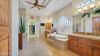 This amazing Chef's Kitchen has a gorgeous vent hood as the centerpiece, and has been remodeled in the last 2 years with new gas cooktop, stainless steel wall ovens, microwave, dishwasher, loads of raised panel cabinets with custom pull out drawers, walk-in pantry, built-in fridge, ice maker, custom porcelain tile backsplash, butler pantry/drybar with wine fridge, and a kitchen island with gorgeous Cambria Stone waterfall countertops! This entertainment kitchen looks out onto the family room and breakfast nook and is the true heart of the home. The family room has brand new carpeting, more plantation shutters, luxury automated Hunter Douglas silhouette lines, and a custom Cantera stone gas fireplace! This floor plan offers Jack and Jill bedrooms, a huge bonus/ exercise room, an oversize laundry, and a wonderful guest bedroom complete with walk-in closet, en-suite, and access out to the backyard. This could also double as the Cabana bathroom!