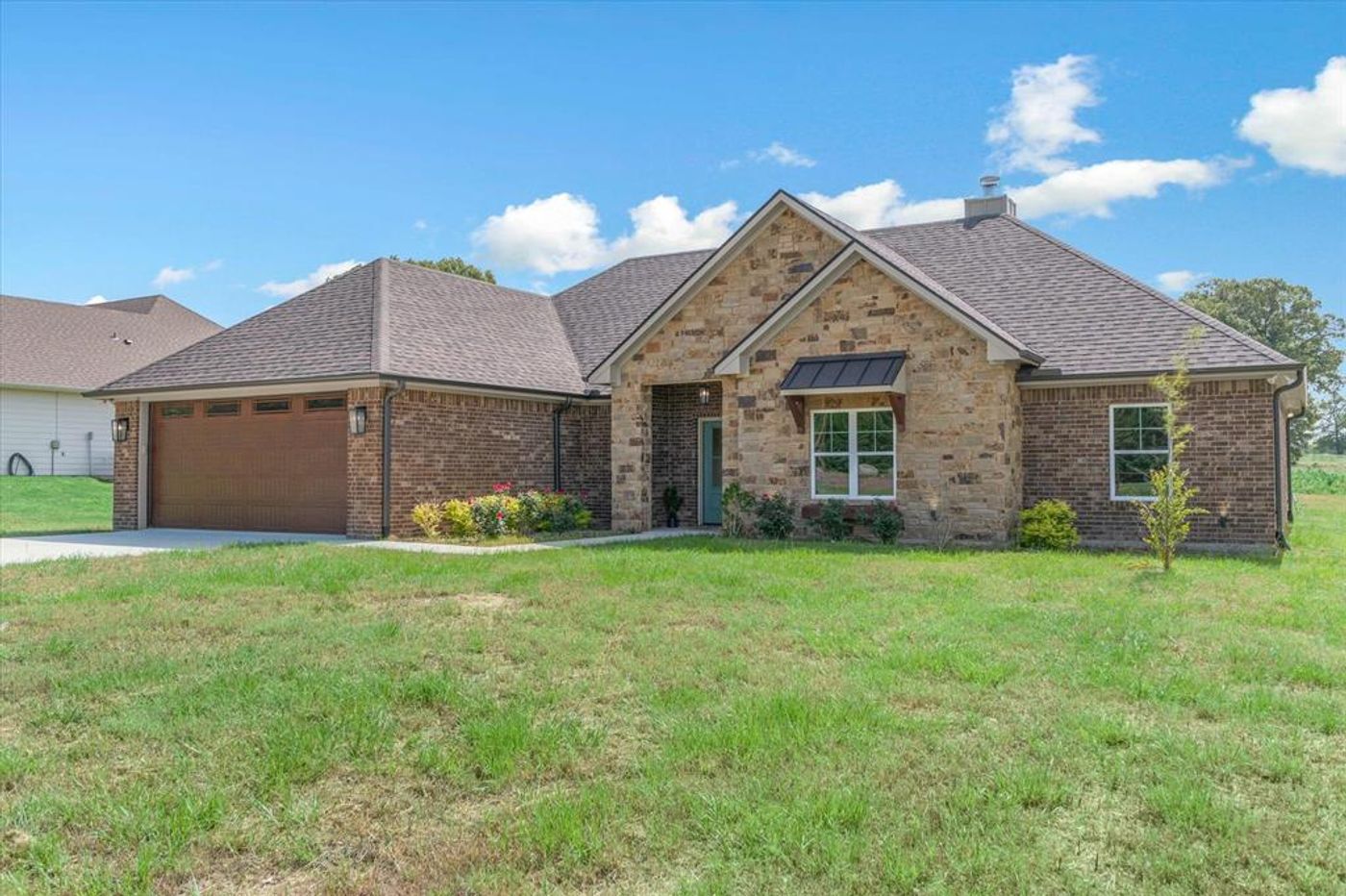 This 2024 complete construction, stone and brick craftsman style home with 4 bedrooms 2 baths on a half-acre, and just a (quick walk) hop, skip and a jump to Lake Holbrook! Gorgeous, eye-catching home has everything you want in a new build! Enter into the living room with vaulted ceilings and floor to ceiling stone fireplace, easy LV flooring, top sash bungalow windows, and an open concept LR, kitchen and dining. Kitchen has a farm sink, lovely quartz island breakfast bar, countertops, tiled backsplash, custom cabinets, and an amazingly large walk-in pantry you will love! Separate primary, with tray ceilings, an ensuite bath with dual vanities, soaker tub, walk-in tiled shower and a deep walk-in closet. A mudroom just off the garage, 3 more bedrooms with a guest bath that has dual sinks and tub shower. Covered back patio looks out to a large half acre lot. Some extras are electric exterior home lighting making the home gorgeous at twilight. landscaping, long concrete driveway, and finished out garage. Surrounded by nice homes! Near all the popular restaurants and amenities in the nostalgic town of Mineola! Mineola ISD!