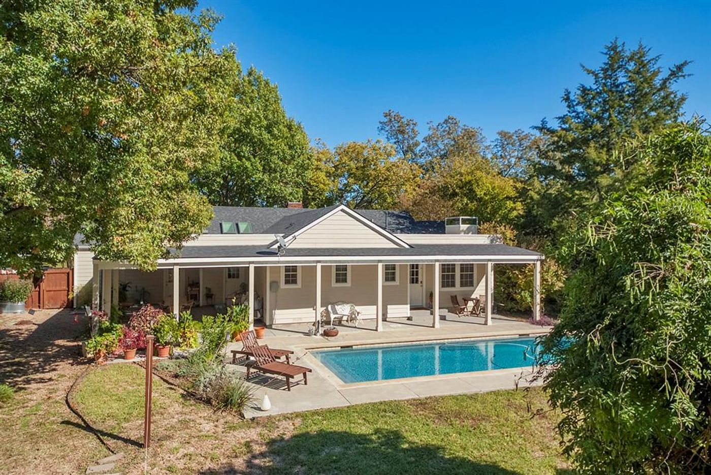 This unique, contemporary-farmhouse redo sits on almost a half acre of Paradise right in the middle of Casa Linda Estates. Taken down to the studs in 2015, and completely re-imagined for a creative writer & photographer couple, it features 2 large bedrooms, 2 baths, and an open Living Dining Kitchen arrangement, with a Library and 2 office spaces in the main home. Beautiful salt-water pool installed in 2015, and a bonus treehouse retreat at the back of property, perfect for a studio or extra guest accommodation. Glass greenhouse, 2 storage sheds with electricity, and privacy galore. Just blocks from White Rock Lake, the Arboretum, and Casa Linda shopping center, it's a veritable oasis in the heart of the city.