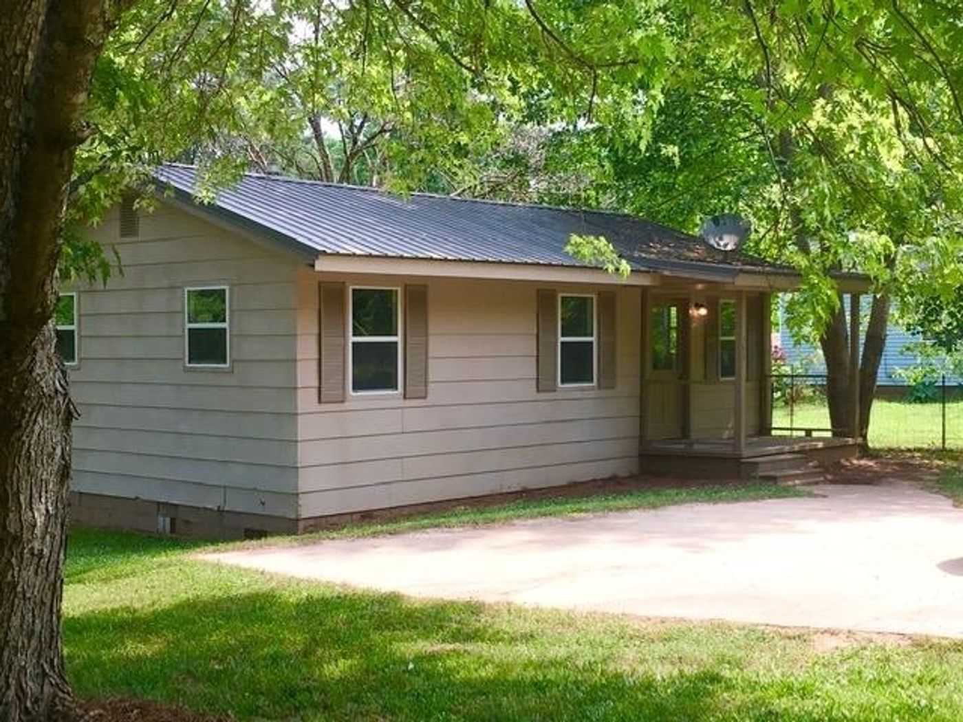 BACK ON MARKET AFTER RENOVATIONS! This home has just gotten a fabulous facelift! Improvements include new flooring throughout, new interior paint throughout, new light fixtures throughout and new HVAC and duct work! The home was also converted from a 1.5 bath to 2 full baths with all new toilets, vanities and shower/tub units! The renovations also created a separate laundry room! From the covered front porch, enter the large front room, which would make an excellent dining room, home office, play room, second living room or a combination of any of these! Off the front room, you will find two guest bedrooms and a full hall bath. The kitchen is centrally located with lots of cabinet storage and a side exit door. The large living room is located toward the back of the home and offers lots of natural light through the French doors leading to the back deck. Off the living room, find the roomy master suite with double closets and private en-suite bath with double vanities. Explore your hobbies in the huge outbuilding/workshop. Other features include a durable metal roof, open 1 acre lot and beautiful mature shade trees. Hurry to make your appointment to see this one today before it's gone!
