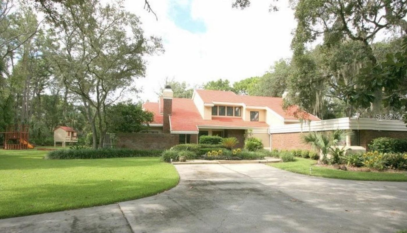 Welcome to your dream oasis in the exclusive, gated community of Wingfield North. Nestled on a sprawling 1.2-acre corner lot, this 4,453 sqft haven boasts luxury, space, and endless potential. As you approach the home, you'll be greeted by a grand circular driveway that provides ample parking for guests and showcases the property's impressive curb appeal. Step inside, and you'll immediately be captivated by the soaring cathedral ceilings, which lend an air of grandeur to the entire home. The main level features a spacious and functional floor plan that includes a large living area with not one, but two wood-burning fireplaces, perfect for cozy evenings with loved ones. The well-appointed kitchen, with its generous counter space and storage, is a chef's delight, ready to host culinary adventures and family gatherings. A standout feature of this home is the downstairs master suite, a true retreat with its private patio access and a wood-burning fireplace. Imagine sipping your morning coffee on your secluded patio or unwinding by the fire in the evening. The en-suite bathroom offers a spa-like experience, complete with a soaking tub, dual vanities, and a walk-in closet. Upstairs, you'll discover three additional bedrooms and 2.5 bathrooms, providing ample space for a growing family or accommodating guests. The functional loft area offers versatility, ideal for a home office, library, or playroom. Outside, your personal paradise awaits. The lush backyard offers a pool, the perfect spot to beat the Florida heat, and plenty of room for outdoor entertainment and relaxation. Mature trees and landscaping provide shade and privacy, creating an inviting atmosphere for gatherings. This home is not just about luxury living; it's also about security and community. Enjoy peace of mind with 24-hour security guards in the gated community, and take advantage of the nearby community tennis courts. For families, this home is zoned for A-rated schools, ensuring an excellent education for your little ones. While this home is already impressive, it awaits your personal touch and vision to unlock its true potential. With a little updating, you can transform this spacious canvas into the home of your dreams. Don't miss the opportunity to make this amazing property your own. Schedule a showing today and start envisioning the endless possibilities that await in this remarkable home. Live the Florida lifestyle you've always dreamed of in this exceptional residence.