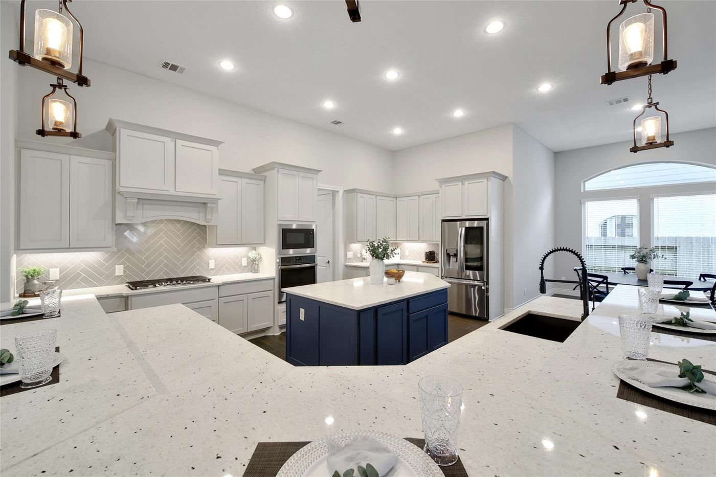 CalculateREADY FOR MOVE-IN! Extended entry with 13-foot ceiling leads to open kitchen, dining area and family room. Kitchen offers generous counter space, 5-burner gas cooktop, corner walk-in pantry and island with built-in seating space. Dining area flows into family room with wall of windows and a wood mantel fireplace. Game room with French doors. Primary suite includes double-door entry to primary bath with dual vanities, freestanding garden tub, separate glass-enclosed shower and two walk-in closets. Secondary bedrooms feature walk-in closets. Extended covered backyard patio. Mud room off three-car garage.