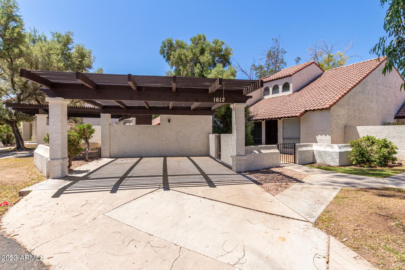 Fantastic opportunity to own this charming 3-bed, 2-bath townhome in Torre Molinos! Displaying 2 carport parking and a gated front entry. Discover a seamlessly flowing living & dining room featuring high vaulted ceilings w/exposed beams! Neutral palette and soft carpet & tile flooring t/out are some attributes worth mentioning. The kitchen has built-in appliances and wood cabinetry. Primary bedroom is downstairs for extra privacy! It boasts sliding doors to the back and a private bathroom w/walk-in closet. Upstairs, you'll find the bright secondary bedrooms and another full bathroom. The perfectly sized backyard with a pergola patio is ideal for relaxing in the morning or afternoon! Let's not forget the nearby Community pool for year-round enjoyment. Excellent Tempe location! Come, see it!
