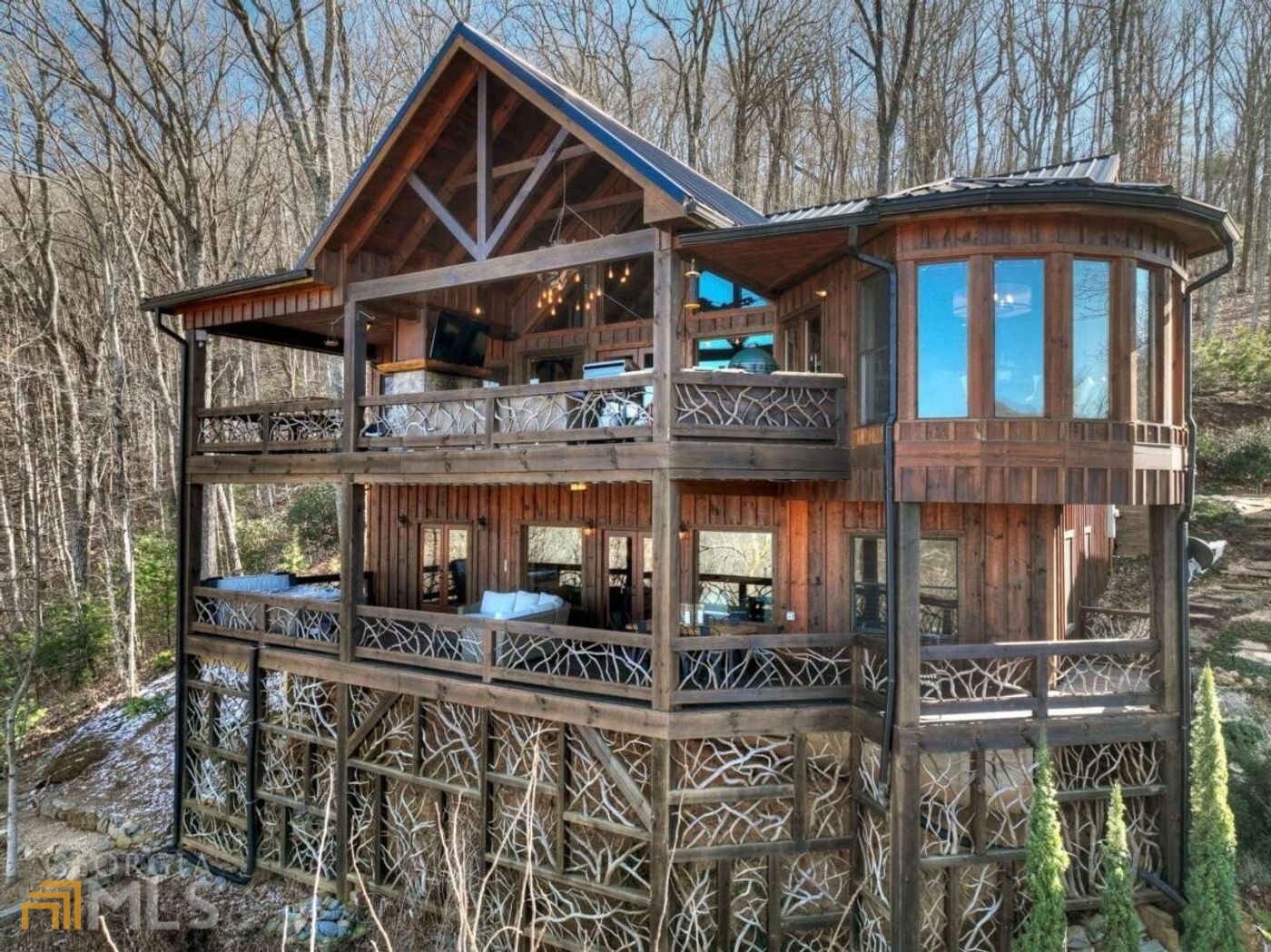 **BREATHTAKING LONG RANGE LAYERED MOUNTAIN VIEWS** A true 10+++. This stunning home sitting on 1.15 beautifully landscaped acres, offers the most high end custom finishes and attention to detail and has just been professionally furnished and accessorized from head to toe by the in demand K&J Design Group. This home is like no other and located in a very upscale gated community of currently 15 homes with community small lake and large covered gazebo area with fireplace. 20 minutes to downtown blue ridge!! This open floor plan with vaulted ceilings, floor to ceiling wall of windows and expansive views from every room will truly take your breath away the minute you enter. Huge vaulted great room with stone fireplace opens to very large eat in kitchen with awesome island that seats many as well as a beautiful round dining area with a custom metal rotunda style ceiling. There are 3 gorgeous stone fireplaces, outdoor kitchen with extra large green egg, 2 propane burners and sink, 2 large covered decks (top deck with floor to ceiling double sided stone fireplace and lower deck with hot tub) all with incredible views and perfect for entertaining or relaxing. Primary bedroom on main level offers entrance to covered deck, bathroom offers stone shower, tub, and double custom vanities. There is also a guest bedroom and full bathroom on main level in addition to a half bathroom. Lower level offers 2 guest bedrooms and 2 full bathrooms, family room with stone fireplace, wet bar with custom cabinetry, live edge bar and wine refrigerator. Laundry room has 2nd refrigerator. Lower deck can be accessed from driveway. There is a 2 car detached garage which sits to the left of home. Please contact listing agent for appointment only viewings.
