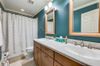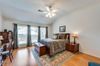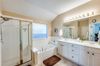 The split bedroom layout offers privacy, with the primary suite tucked away at the back of the home. A wall of windows fills the bedroom with soft natural light. The ensuite bath includes a garden tub with a large opaque window above, separate shower, private toilet room, walk-in closet, and dual sinks. The guest bathroom also features double sinks, Corian countertops, dual mirrors, and a stylish custom color finish.
