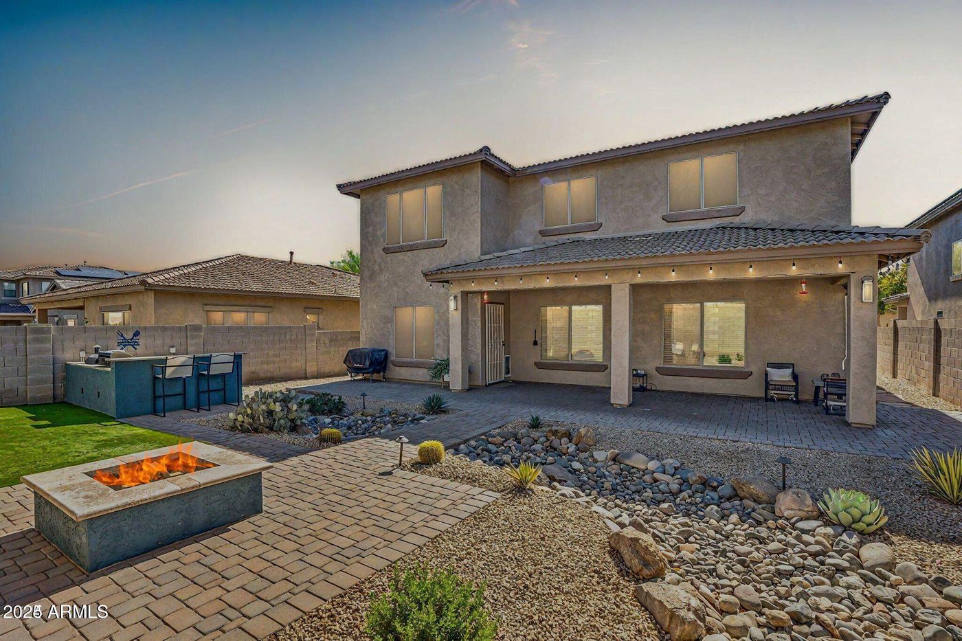 Step outside to a show-stopping backyard! Enjoy a fully equipped outdoor kitchen with a built-in grill and smoker, plus plenty of seating around the firepit. With synthetic grass, a soothing water feature, enhanced lighting, and a spacious covered patio, this space is perfect for year-round enjoyment.