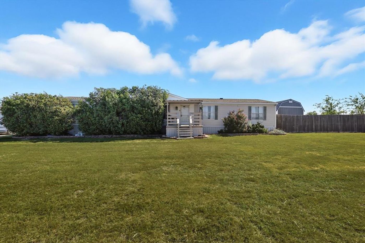 CalculateSPACIOUS HOME ON 2 ACRES! Plenty of room for a big family in this nice 4 bedroom 2 bath manufactured home with 2 large living areas. The island kitchen is wonderful with plentiful storage and counter space. Large Primary with garden tub, dual sinks, separate showers and TWO large closets. Split bedrooms and a LARGE great room at the end of the hall that offers has SO MUCH potential for what it could be used for. Covered front porch and large deck off the back looking out over the acreage. Property is fenced and cross fenced with pipe and smooth wire for a horses, goats or sheep. 2 large storage buildings, large back yard, PLUS inground storm cellar. So many options for this place. NO HOA or City Taxes. New AC recently installed, and home has a Metal roof.