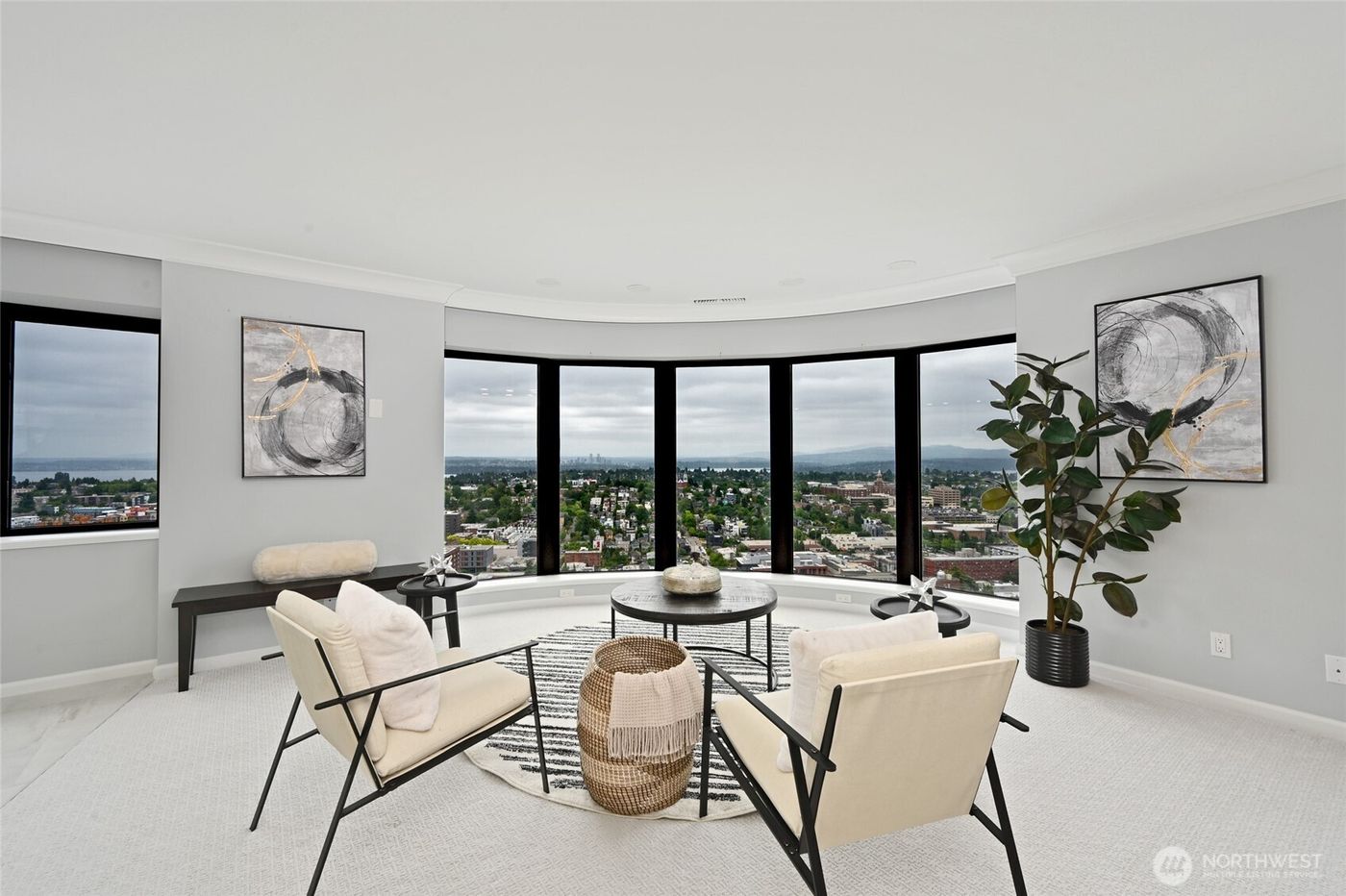 This is the penthouse life, the top floor pinnacle! Sweeping city views - 180+ degrees of Seattle grandeur. Perfectly perched on Capitol Hill's west bank for wonderful walkable access to all city attractions, amenities, and nightlife. Floor to ceiling windows in living and dining adjoin large covered patio where you can take ALL of it in. Breathtaking! Beautifully updated interiors, polished concrete floors and fresh paint throughout. Kitchen has granite counters and gas cooking. Private primary suite features glamorous tiled bath with skylight. In-unit laundry. Two deeded parking spaces in garage. Two large deeded storage spaces. Roof top deck and fully fenced grounds. Efficiently managed boutique building with high owner occupancy.