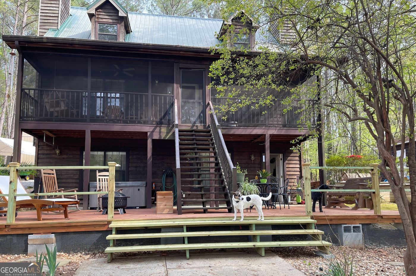 EXCEPTIONAL VALUE on this charming lakefront Cape Cod Cabin on Lake Sinclair. This is one of today's best offerings just in time for our Spring market. This lovely place is located in the Rockville Springs area on the lake and is conveniently located between the Lake Oconee commercial district and shopping and restaurants in Eatonton and Milledgeville. The owners have spent the last ten years turning this house into a home. They have renovated the kitchen and all the bathrooms, added new flooring, a new roof, new HVAC systems, a water heater, a large workshop that is heated and cooled, a covered carport, a stone foundation facade, a single-stall boathouse and dock, lots of landscaping plus many more improvements to the house. The home is warm and inviting the minute you walk in the door. The natural walnut flooring and hickory cabinetry of the kitchen make this space feel open and bright with all the natural light. The open Greatroom plan overlooks the lake and has a fireplace with gas logs for cold weather. The powder room has been remodeled with tiled walls. The kitchen was opened up to overlook the living area with a bar and granite countertops throughout the kitchen and dining room area. The sellers are leaving all the stainless steel appliances with the home. The master on the main overlooks the lake and has its own fireplace with gas logs for cozy nights. The remodeled master bathroom has a tile shower with glass doors, a double bowled vanity with drawers and storage, and complimentary countertops plus brushed nickel fixtures. Upstairs you will find two large bedrooms and another remodeled full bath with a soaking tub. These other rooms could also function as a study or home office. Leading out from the main level you will find a screen porch overlooking the lakeside yard. On the terrace level, you will find a patio and extended deck ideal for grilling out or just chilling in the hot tub, and the sellers are also leaving both the grill and hot tub with the home. This area expands the entertaining friends and family space out into the natural setting of this park-like yard. The 2 rockers, rolling planters, and bench with live edge stay with the house. Don't miss the unique single stall-boathouse and dock designed specifically for this lot. The boat lift conveys and there is electricity to the boathouse with lighting. The lot has over 100 feet of water frontage and about 4 feet at the dock. The water on this cove will accommodate a fishing or pontoon boat. For the sports enthusiast, the sellers are leaving the 2 kayaks with oars and the stand with the house. The swing set by the water also stays. For the man of the house, there is a large workshop that is heated and cooled. The covered carport coveys as well. The owners have done some modifications in the basement by adding the laundry room and workout area. They are leaving the washer and dryer, a second refrigerator, the treadmill, and the ping-pong table with the house too if buyers want them. There is a new 85-gallon water heater too. For the furry family member, the sellers are leaving a dog watch electric fence encircling the property, and 3 collars. These sellers have done lots of landscaping and drainage design for the rainwater. They also added the stone foundation facade to dress up the house and finish it off as well as the stone step walkway down to the boathouse and the pebble gravel area along the water's edge.