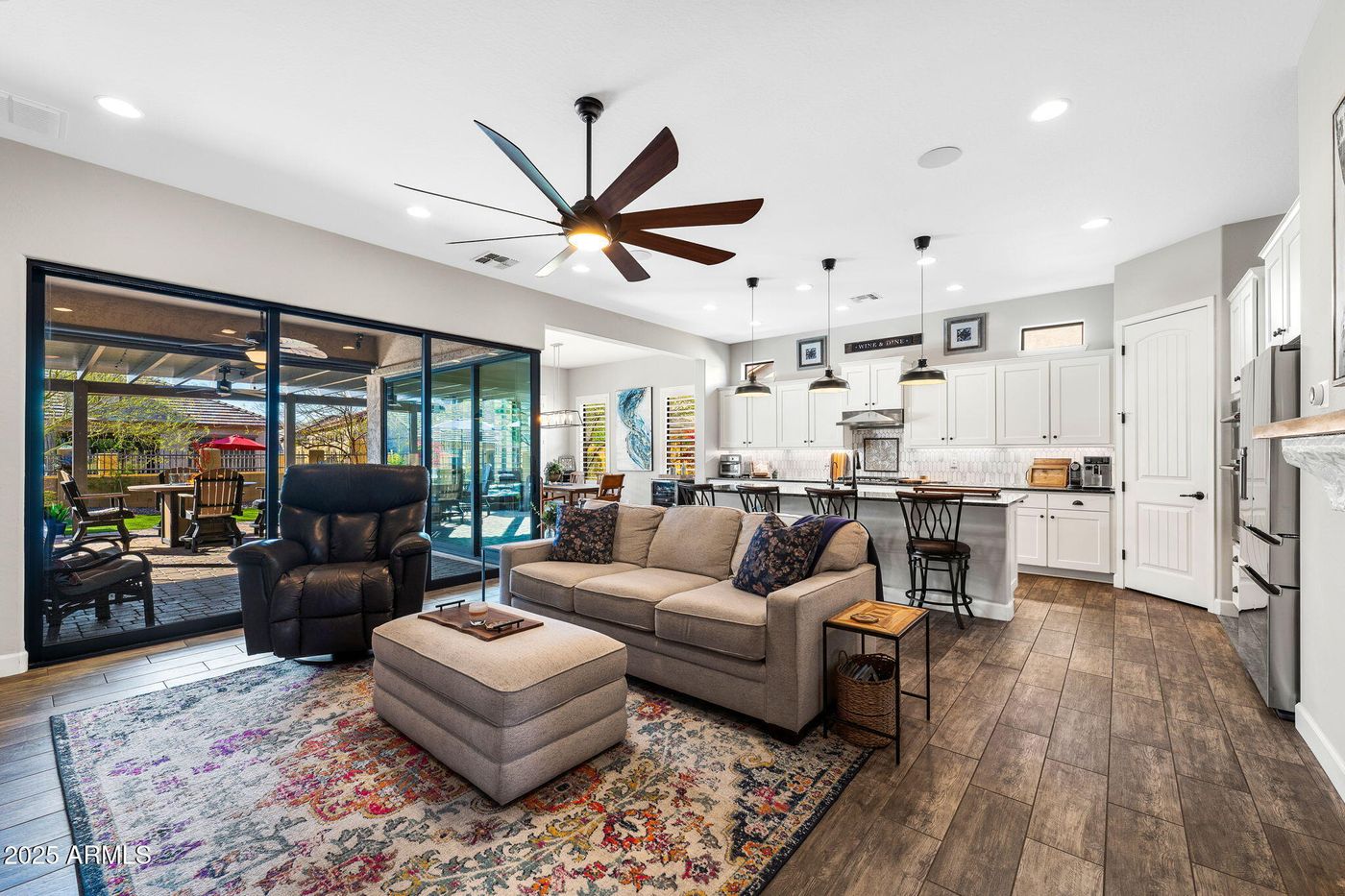The sellers are relocating out of state, presenting a unique opportunity to acquire this highly upgraded home situated on an oversized lot in the newer Sanctuary Community of the award-winning Mountain Bridge development. This welcoming, active, gated neighborhood makes this home perfect for entertaining. It features designer paint and custom shiplap on walls throughout giving it a model home feel. It has a spacious, open-concept great room, a double disappearing wall of glass, an extended custom pergola patio, and a raised, lighted sun deck offering stunning city and mountain views. The gourmet kitchen is equipped with high-end appliances, including a gas stove and a walk-in pantry. The main living areas are complemented by upgraded wood-look tile, while the garage offers custom cabinetry and ceiling storage racks. Additional features include a generously sized laundry room, with washer and dryer included, as well as a water softener and RO drinking water system. The extended driveway provides ample space for up to five cars.