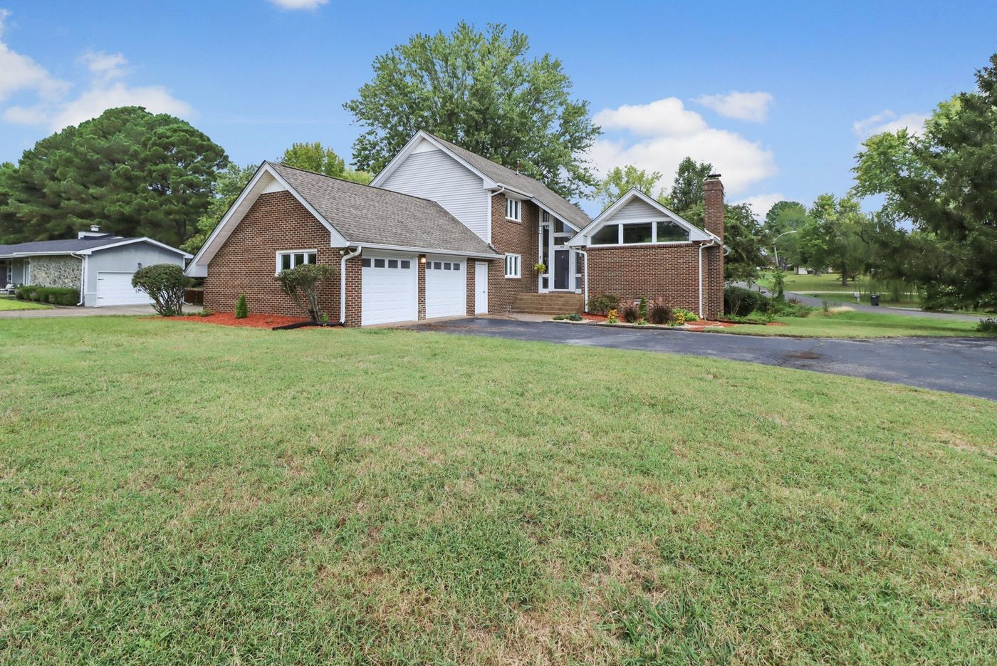 Newly renovated move-in ready home on almost half-acre, corner lot in city limits with beautifully remodeled kitchen with additional breakfast nook that includes all new stainless steel appliances, including refrigerator, granite countertops and composite sink. New flooring throughout the first level, refreshed gas fireplaces in dining and living areas. New modern black steel railing inside and out. Screened-in back porch off dining area with newly constructed stairs leading to the concrete patio and walk-in storage shed enclosed by privacy fencing. All new lighting fixtures throughout home. Fresh paint on every wall including the garage. New tile shower in main bathroom as well as new tub/shower combo in second bath. Spacious laundry room on main level. All new Pella windows installed August 2022. Additional half-bath located on main level. Possible home office or school room also on main level off of kitchen area.