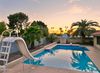 Sitting on an oversized lot, the outdoor space features a sparkling diving pool with a slide, a large covered patio, and a lush grass area.