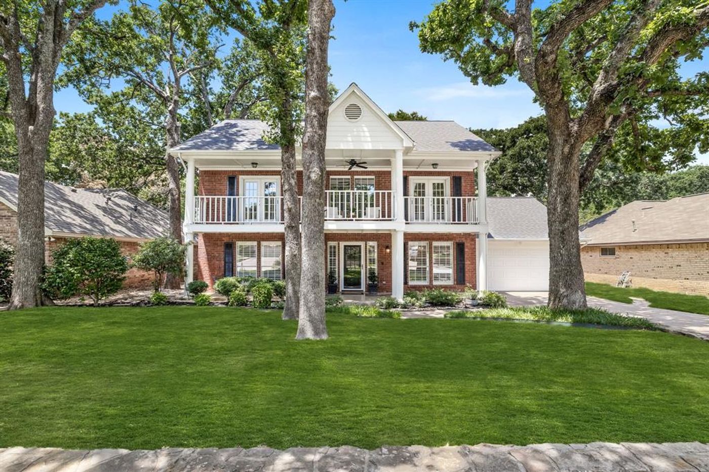 Charming Colonial-Style Home in Southlake Carroll ISD! Nestled among mature trees, this stunning 4 bed, 3.5 bath home is a perfect blend of classic elegance and modern convenience. The kitchen boasts granite counters, ss appliances, and double ovens. With two living areas, one can easily be converted into a spacious study or media room. Family room has gas fireplace and ample natural light. The thoughtfully designed plan includes a large laundry room and a half bath located off the kitchen. Primary suite features French doors that open to a balcony with a lovely view, and an updated bath with dual sinks, clawfoot tub, sep shower, and a walk in closet. Guest bedroom with full bath is located on the ground floor, providing privacy and comfort for visitors. The beautifully landscaped backyard is an oasis with a sparkling pool, perfect for relaxation and entertaining. Located just a short drive from downtown Grapevine, this home also offers easy access to major freeways for your commute.