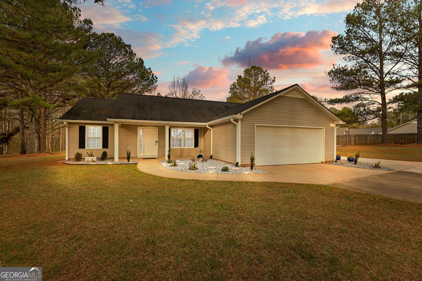 Welcome to your new home! This property is nestled in the highly desirable area of Senoia, situated on a nearly 2-acre flat plot. Its convenient location offers easy travel and added bonus of no HOA. This 3-bedroom, 2-bathroom ranch-style house boasts a stepless entrance and a split layout. The kitchen is recently updated, featuring modern appliances, hard-surface countertops, and new cabinets with soft-close mechanisms. The versatile flex room could serve as an office, playroom, or additional family room. The master bedroom is sizable, comfortably fitting a king-size bed, and the master bath has been recently updated with a stunning oversized walk in shower, new vanity and walk-in closet. The secondary bedrooms offer ample space and generous closet storage. The laundry room is updated with new overhead cabinets. The backyard, with its lush, well-maintained lawn, is perfect for unwinding at the end of the day. The extended back patio is great for grilling, dining, or socializing. In the front, the concrete driveway has been widened to allow extra parking space.