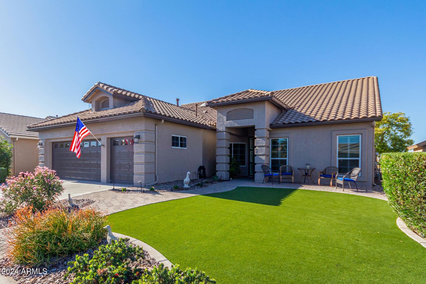 Outstanding GOLF & WATER VIEWS! Bellagio Model w/ 2 Bedrooms 2 Baths, 2.5 car garage. New Roof 2024, New AC 2022, with UPDATED pool & Built-in BBQ, Firepit & Misting system. Greatroom & Kitchen lined with windows to enjoy the Lake Golf Views. TILE FLOORS, Vaulted Ceilings & UPDATED Kitchen / Baths. EAT-UP Bar + Office Area w/ CUSTOM BUILT-INS. SPACIOUS PRIMARY Suite has Double Sinks, heated Floors, NEW Walk-in Shower & WALK-IN CLOSET. Plenty of Storage in Laundry. French Doors from the Primary Bedroom lead outside to the patio overlooking breathtaking views from Sonoran #4. Come enjoy Sun Lakes (Oakwood) with its amenities including golf, tennis, pickleball, pools, fitness center, clubs, social activities & restaurants.