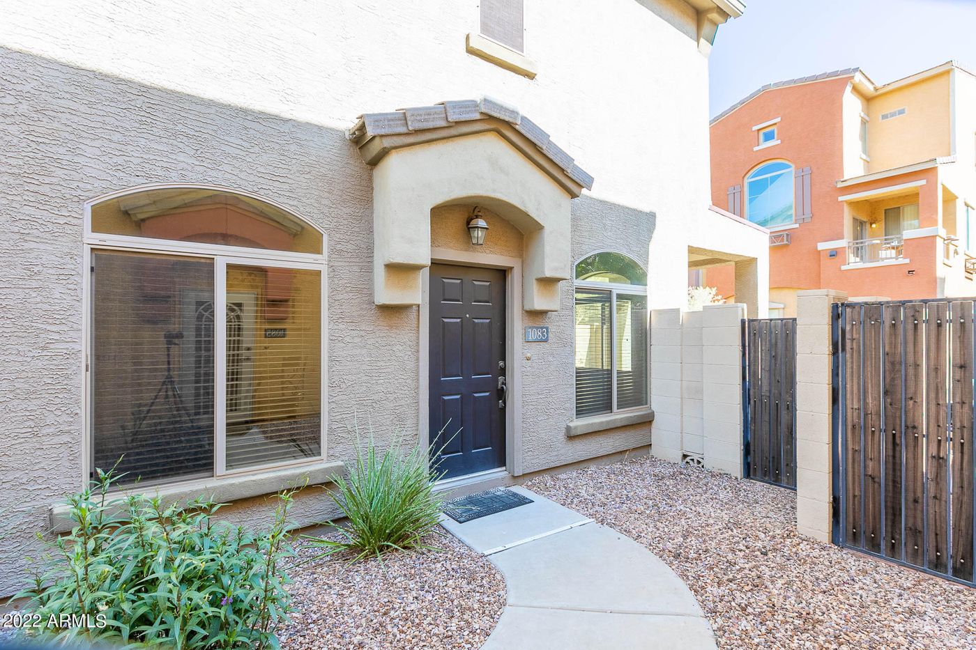 RARE end unit with first floor living and a small yard. Island kitchen, granite, stainless steel, tall ceilings, pantry and direct entry from the garage. Both upstairs bedrooms have private baths. Beautiful hardwood floors on first floor. Upstairs you'll find two bedrooms and beautiful laminate flooring. AC new Aug 2022, Garage door opener new 2021, Water heater new 2019, smoke detectors new 2021. Complex is currently being repainted with modern colors. Across the street from the Cubs stadium, close to Tempe Marketplace and not far from Riverview Marketplace.