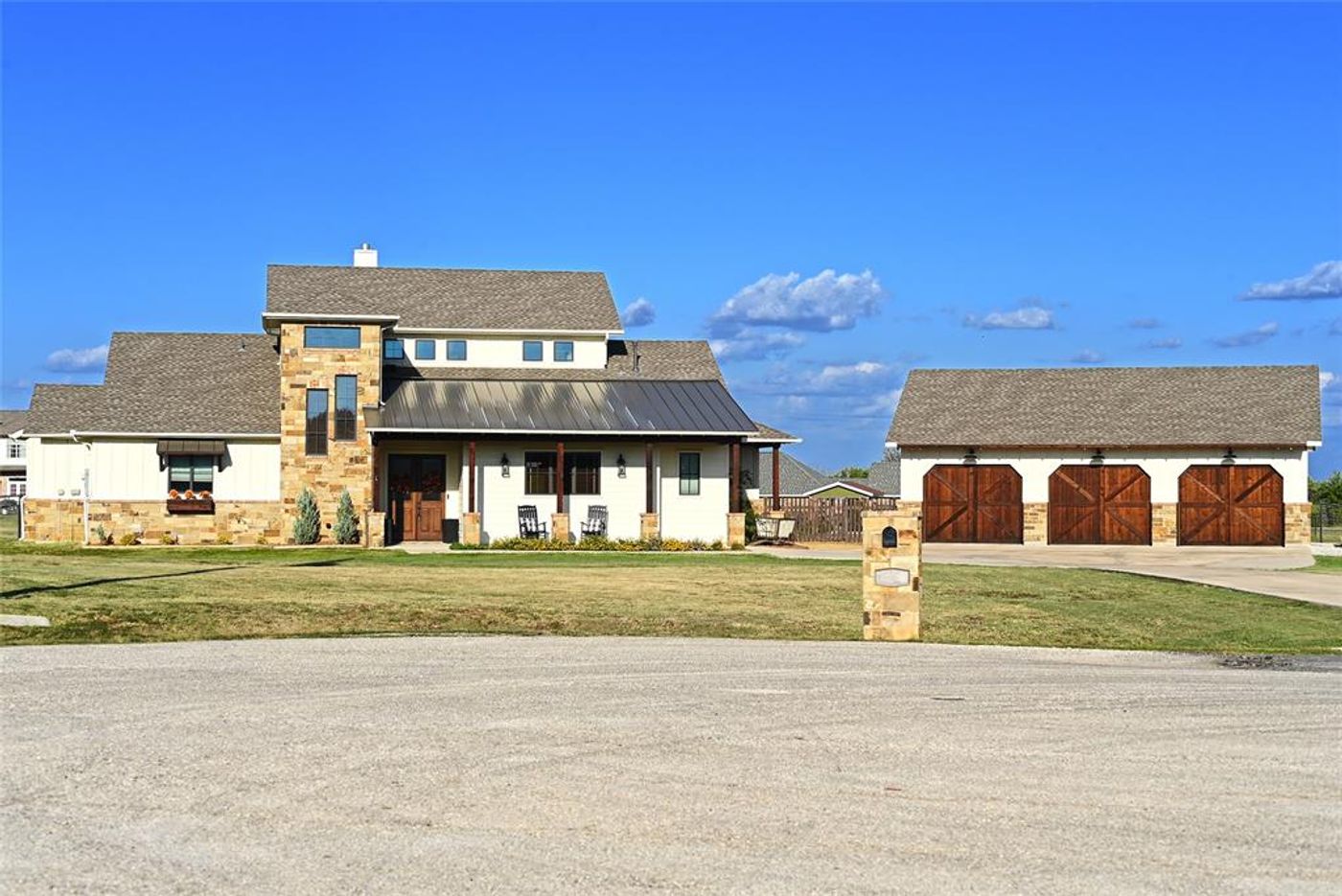 Come to the country. Beautiful 3 year old custom on one and a half acres. Large Island Kitchen with all Kitchen Aid appliances, includes refrigerator. Extra storage closet downstairs includes fire rated safe. Well built with all foam insulation for lower utilities. Rock fireplace with gas insert. Solid core 8 foot doors throughout. Vaulted primary bedroom that opens on to patio. Upstairs is a living or game room with a kitchenette also includes refrigerator. large balcony with a view of Lake Ray Roberts and separate bedroom and bath. Large attic space. 1,200 square foot garage is also insulated. Extra parking and more room to build.