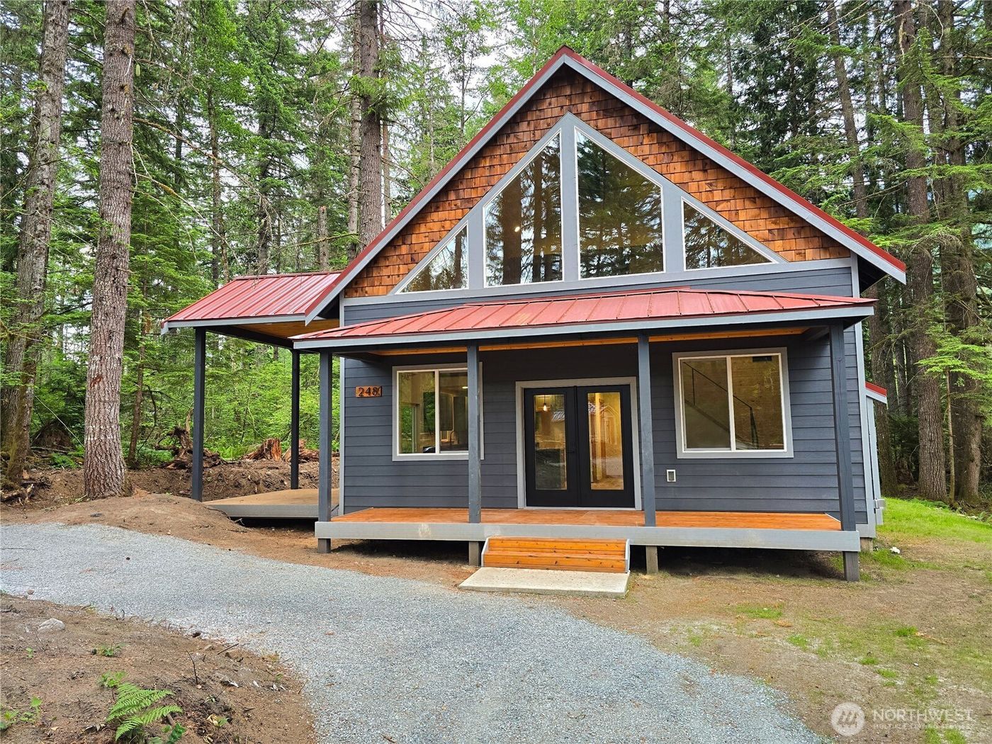 Private cabin in the woods. This modern 3-bedroom, bonus room with 2-baths. Cabin is a showstopper with its vaulted ceiling adorned with light wooden walls and a floor to ceiling stone fireplace. It offers vaulted ceilings with large windows showcasing the forest views. The kitchen is equipped with sage green cabinetry, quartz counters, stainless steel appliances, subway tile backsplash and a custom tiled shower. Outside has and 3 covered wooden decks that seamlessly connect to the surrounding forest on the large, wooded lot, Metal Roof, it's all prewired for generator and hot tub and includes a 4-year AHS warranty, not in an HOA. Come see it today!