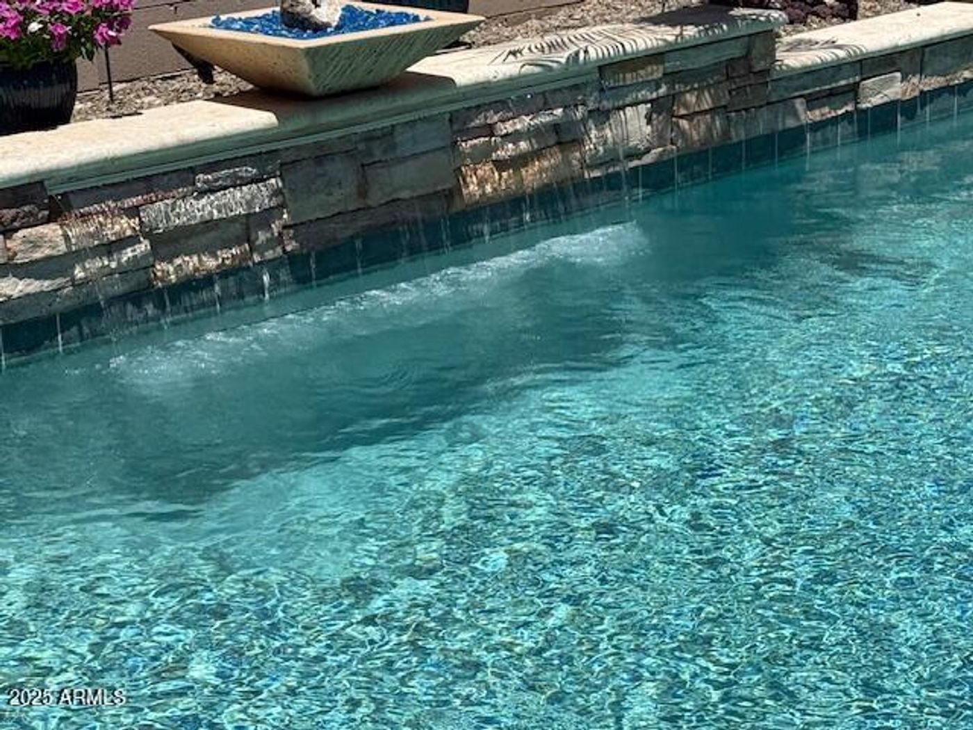 CalculateElegant Voyage floor plan featuring 3 bedrooms & 2.5 baths with a desirable split layout for privacy. A stone-accented foyer wall sets a dramatic entry, leading to custom faux-wood beams, upgraded wood flooring, a Chef's kitchen with granite countertops throughout, & a built-in entertainment wall combining style & practicality. The primary suite offers His & Her closets, a beautifully tiled bath & direct laundry access, with tile flooring in every bath for a polished finish. The 3-car garage boasts epoxy floors, built-in cabinets & insulated doors. Step outside to a fully enclosed backyard with view fencing, perfect for Arizona sunsets, plus extended travertine patio, fire-pit, paver courtyard, walkway & soothing water feature. A custom iron front entry gate completes this showcase home.