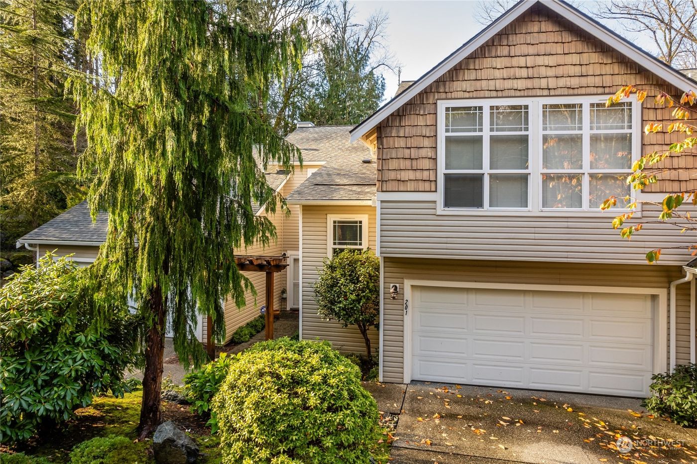 Tranquil 2BD 1.75 BA Southside condo in quiet cul-de-sac. Ground floor entry with 2 car garage plus off-street parking. Vaulted ceilings, skylights, plenty of windows enhance the serenity of this 1543 sf upper unit with woodland/wildlife views. Versatile den/office space at top of stairs. Spacious living room with cozy, gas fireplace. Open kitchen with breakfast bar flows into dining area. Sliding door leads to private patio. All appliances, including washer/gas dryer. Handsome primary suite has 3/4 bath and walk-in closet. Close to Interurban trail system with access to Fairhaven parks, shops, dining and breweries. Seller needs to rent back for 30 days.
