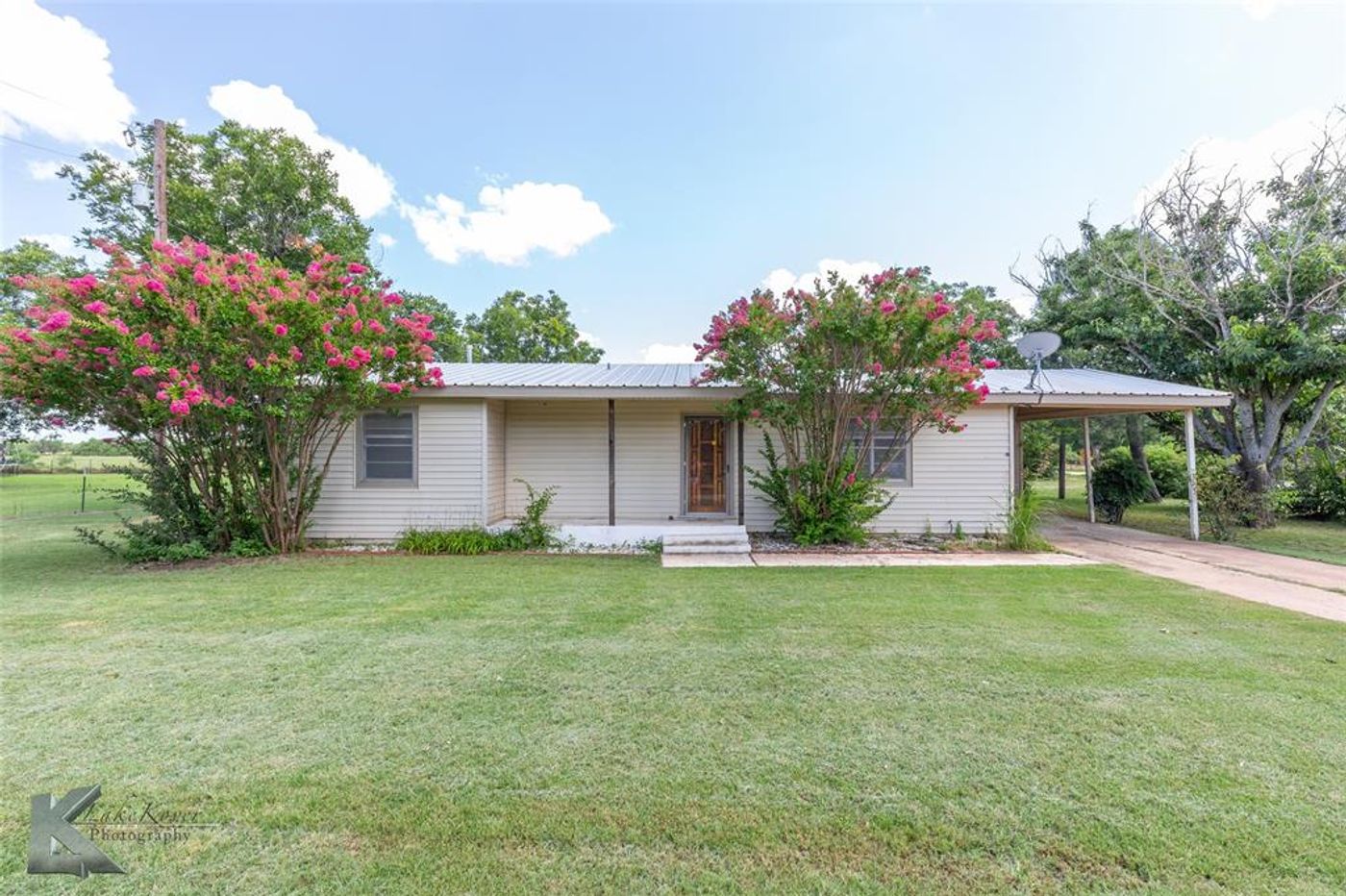 Move-in ready home in the popular Jim Ned ISD, just 15 minutes from Abilene! This charming 3-bedroom, 2-bath home sits on a landscaped half-acre corner lot with lots of space. Enjoy the cozy front porch, mature trees, and a big backyard perfect for playing or hosting guests. The living area has original hardwood floors, and the kitchen and dining have updated flooring, stainless steel appliances, and a tile backsplash. The primary bedroom has its own bathroom, built-in cabinets, and a walk-in closet. The hall bath has been updated with modern touches, including stylish shiplap walls. There’s plenty of space to add a shop—enjoy peaceful living and make this home your own!