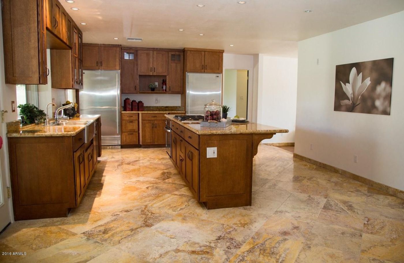 Wonderful Arcadia Lite 3/2 home. Updated with top tier appliances. You will want for nothing as you walk to local eateries, and are in the heart of the most livable neighborhood in Phoenix. The previous owner took great pride in the ownership of this home, and it shows. It is truly move-in ready. Here's a list of features that make this an even better deal for you... Over 1800 sq ft of Matching Traver-tine. 400 sq ft hardwood floor in living room. Newer Roof (less than 5 years) Extra insulation including garage. Split system gas-pack Refrigeration Unit separate for Garage. Garage is 2 1/2 cars Extra room for work area + 2 bonus storage rooms. Front and rear Patios in hand laid flagstone. Matching Granite through, including bathrooms, fireplace and kitchen.