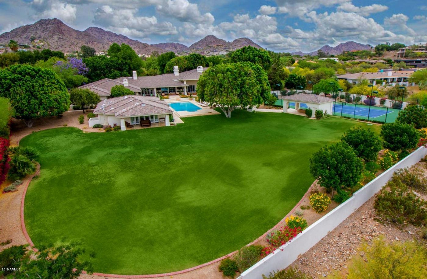 BEST VALUE. The private grounds alone is worth 3.5 Million Dollars; privately gated on 3 plus acres, views from every angle to include a home that defines luxury resort style living. The interior features soft and elegant tones which embodies today's transitional style. Top of line Crestron smart-home system paired with indoor and outdoor Audio/Video systems makes this property easy to control from any place in the world. The Chef's kitchen is gorgeous, highly functional and features all of the high end appliances. The multiple indoor living spaces flow seamlessly to your outdoor oasis which includes a 1,628 sq ft detached guest casita with a full kitchen, tennis court, BBQ Ramada with a full outdoor living space and kitchen for entertaining guests. Multiple fireplaces throughout the home give ambiance and set the tone for each living space. The split floor plan features a 5 bedroom en suite wing. The outdoor spaces surround the tranquil pool and spa area which gives the feeling of being at a private resort. The master retreat is spacious and features a private balcony with unrivaled city light views, dual closets, high end Robern vanities, steam shower and much more. Sit back and watch a movie in the state of the art theater or enjoy some time in the library. Close proximity to Phoenix Country Day, airports, as well as all of the shops and restaurants the area has to offer. This estate boasts grounds rarely found in Paradise Valley and is a must see.