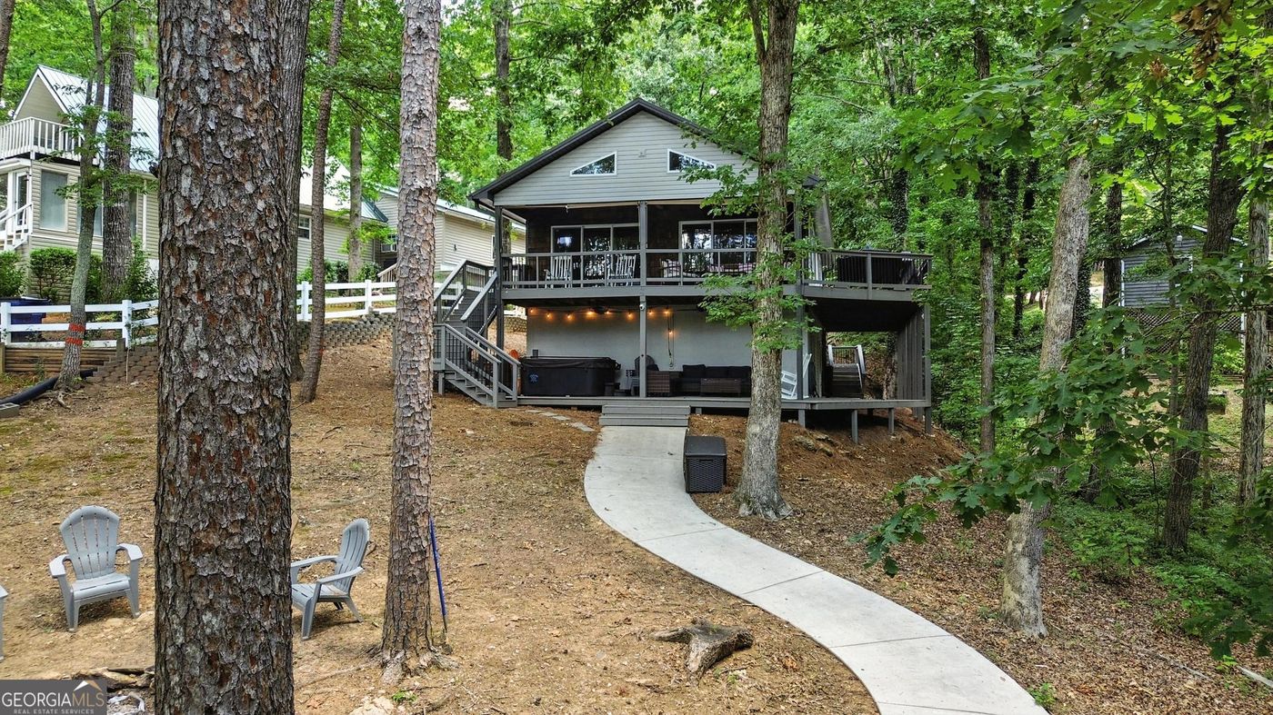 This Lake Hartwell home offers 3 bedrooms and 3 full baths across two finished levels and has been recently updated with a new HVAC system and a concrete path leading to the covered slip boat dock with lift. The main floor features a vaulted great room with hardwood floors, seamlessly connected to the open kitchen and dining area. Step out onto a spacious, covered porch that spans the width of the home and flows into a large open deck, perfect for grilling and enjoying lake views. The main level includes two bedrooms and two full bathrooms. Downstairs, the terrace level offers a third bedroom, an additional full bath, bunk room with built in bunk beds. A generously sized bonus room that makes a comfortable space for watching TV or playing games. There's also a quiet nook ideal for a home office, allowing you to work while soaking in the lakeside atmosphere. A second covered deck on the lower level leads to the improved concrete path down to the lake, where you'll find a covered slip dock complete with a boat lift and PWC lift. Located in a protected deep water cove, the dock offers stunning views of one of Lake Hartwell's main channels. This home is move-in ready, with furnishings negotiable.