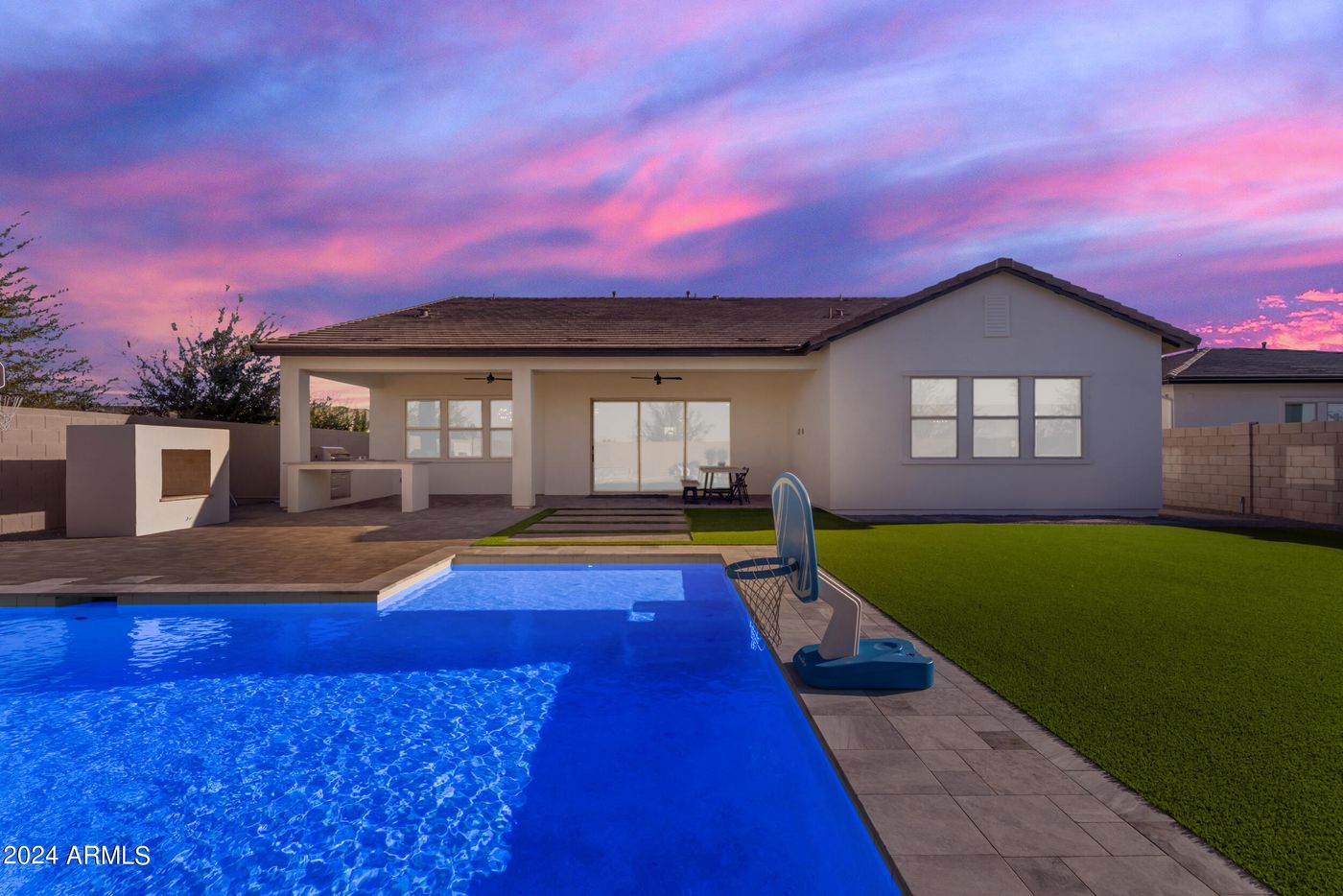 As the day winds down, fire up the outdoor kitchen for a sunset meal, then cozy up by the outdoor fireplace, the desert sky putting on a starlit show. With luxury vinyl plank flooring throughout, a 4-car garage for all your storage needs, and seamless indoor-outdoor living, this home is as comfortable as it is functional.