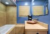 The hall bath showcases a beautifully tiled floor-to-ceiling tub/shower combination with a deep soaking tub and custom seating bench, complemented by striking slate tile floors and a warm wood vanity accented with tiled countertops and backsplash. Finishing touches include a custom mirror, upgraded lighting and quality fixtures.