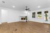main living space, where expansive windows frame a peaceful view of the backyard. Just