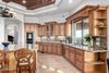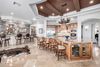 A chef-inspired gourmet kitchen showcases exquisite craftsmanship with custom cabinetry, professional-grade appliances, double ovens, a gas cooktop with pot filler, built-in coffee maker, and stunning custom granite countertops. The oversized prep island provides ample space for both culinary creations and casual gatherings.