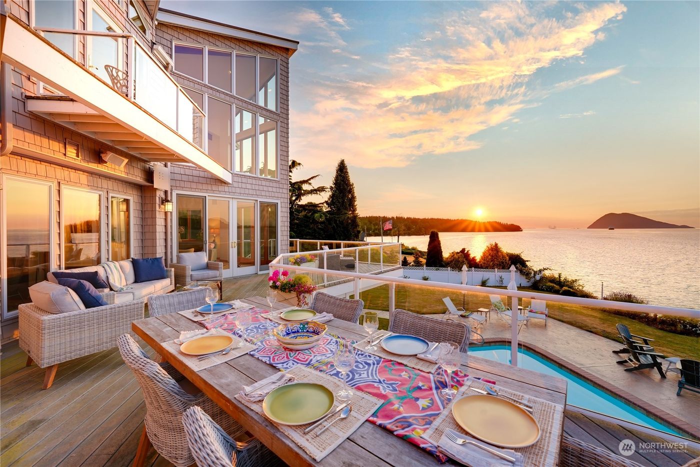 Classic Oceanfront home with impeccable craftsmanship. Breathtaking panoramic views of Samish Bay. Beautiful living room with lofty 30' ceiling & walls of windows. Chef's kitchen, generous counter space & walk-in pantry. French doors to the deck, enjoy sunrises & sunsets. LLevel guest suite has a full kitchen, living room, & ocean views. Relax by the pool, soak in the hot tub or catch a movie in the impressive media room. Just steps to the beach for crab, oysters, fishing & boating. Enjoy private 95' of waterfront with large deck & lift. Stroll to pickleball, tennis & basketball. Bike to Edison art galleries, shopping & lively restaurants. Samish Island is a charming drive-on island offering a quiet, casual lifestyle. See Feature List!