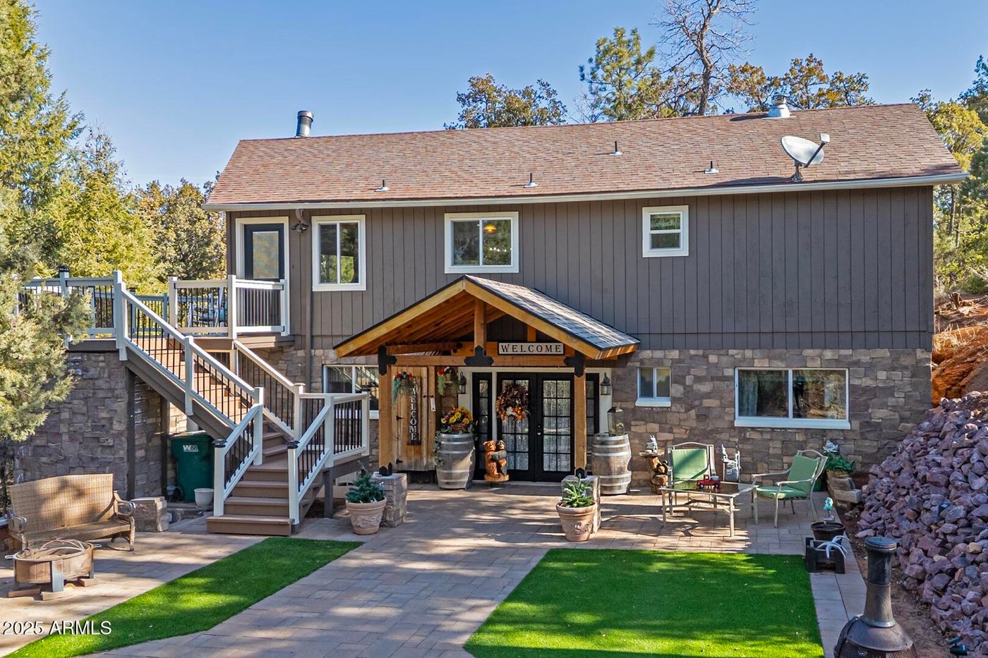 Enjoy total privacy on this nearly 2 acres of equestrian friendly property. Enter through the wrought iron gate. There is a gorgeous, panoramic view of the Mogollon rim and surrounding mountains. Watch the birds, hear the wind blow through trees, and see wildlife from the 800 sq ft. wraparound, Trex deck. Enter into the charming Great room with a large gas Fireplace. A dining area and custom breakfast bar lead to the upgraded kitchen. The master suite has its own bathroom and spacious walk -in closet. Walk through French doors to the deck. The finished walk-out basement has a family room, game room, full kitchen, laundry room and bedroom, shower and separate toilet. Outside is a detached, oversized 2 car garage, tool shed and greenhouse.