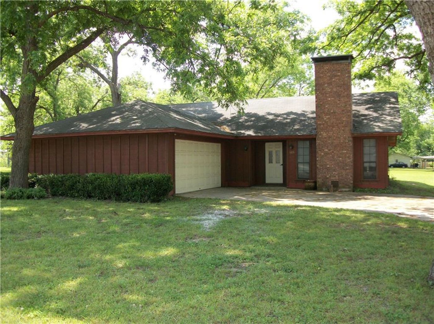 PRICE REDUCED!! Small town living at its finest. Three bedroom two bath home on oversized lots with beautiful mature trees. Shade everywhere. New roof and fresh paint. Large living area with wood burning fireplace. Separate dining area and breakfast area in kitchen. Walk in closets and separate utility room.