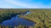 The front entry opens to a wall of glass framing the view, an expansive open plan with a grand dining room, showpiece kitchen with new countertops, lighting and an envy-worthy pantry, and a stone-clad living room anchored by a fireplace and the bluff beyond. Hardwood floors run throughout. The primary suite offers a second fireplace and a spa-style bath with separate tub and shower. The guest suite enjoys its own full bath, a dedicated office and library with wet bar, and access to a screened porch. Every side of the home is ringed with porches to drink in the light, wind and woods.