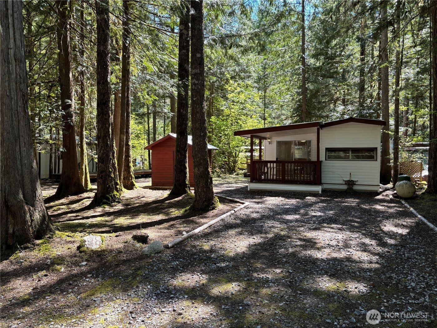 A great opportunity at The Glen at Maple Falls! This '08 Breckenridge Park Model is in great condition. The lot is nice and level, graveled, and awaiting you and your ideas! Has a covered porch to keep you dry if it's raining. Shed in front in great condition. Fire pit area in back. The lot gets plenty of sun. Primary bedroom in back and has hide-a-bed in front w/privacy curtain for guests. Almost everything stays! The Glen has 2 pools, hot tub, sauna, 2 clubhouses, family center, library, tennis courts, laundry facilities, river access, playgrounds, trails, 24/7 security w/ gated entrance, and so much more! Located minutes from Mt. Baker. The Glen is zoned rec for 120 days use per year.