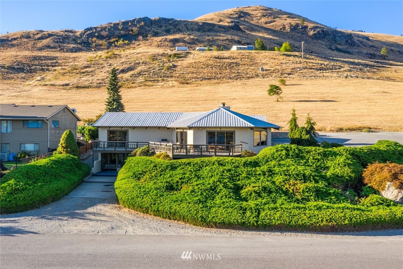 Lk Chelan- Sweeping views from this mid-century modern home. Featured in Sunset magazine in the 70's, the home has been impeccably maintained in its original style. Main level living includes kitchen, dining, open concept living room & 2 bdrms. Lower level can be accessed by a separate entry w/ extra parking. Two more bedrooms and bathroom make this perfect for extra guests. Detached garage & carport with plenty of parking above for toys & full hook up for RV. Short walk to downtown Chelan.