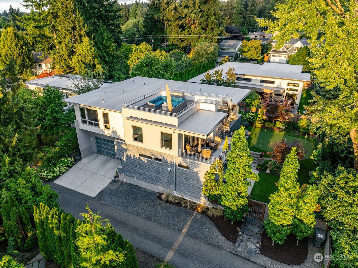 Located in arguably one of the best neighborhoods in Kirkland, this custom-built luxury home showcases impeccable quality throughout. The comfortable great room is highlighted by the chef’s kitchen, with quartz counters and custom cabinetry. Gorgeous primary bedroom with elegant 5 piece luxurious bath. Fun and private grounds with putting greens and entertaining spaces. The rooftop deck offering top-of-the-world vistas with 360° panorama views that span from lake to mountains, culminating in the city skylines.The architectural elegance to the breathtaking panoramas, it stands as a testament to the finest in modern living. Never miss a sunset from the expansive top-floor deck. Short walk to waterfront, Met Market, Lakeview elementary & CKC.